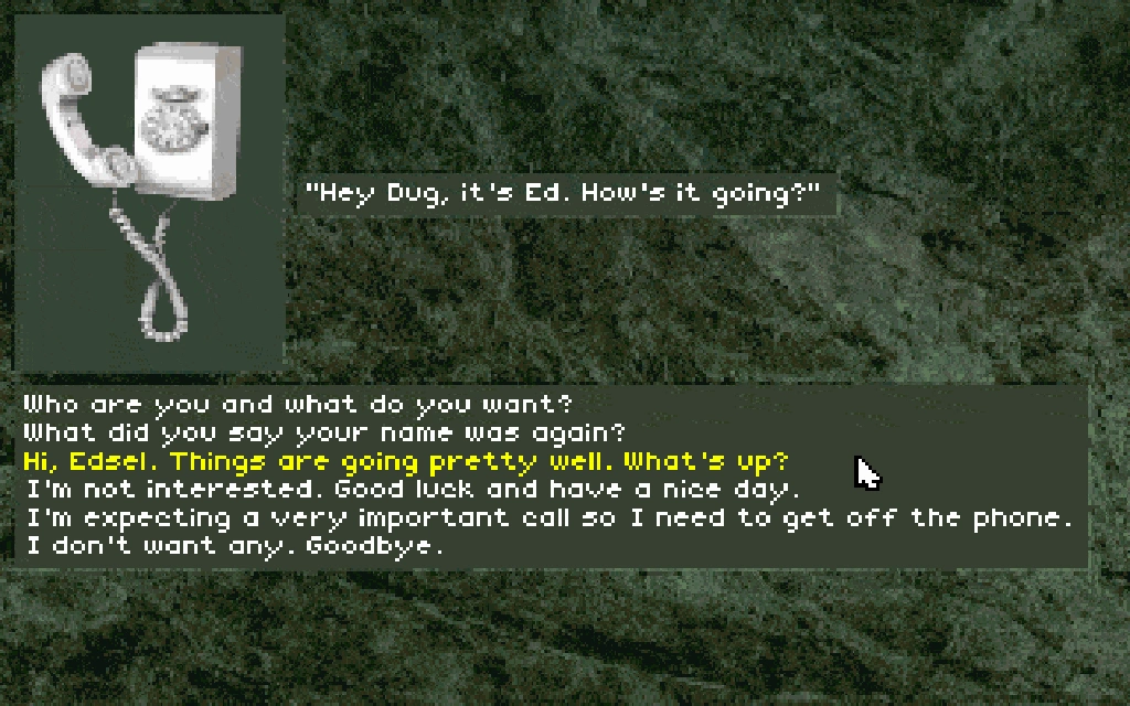 Obrazovka je rozdělená na několik částí. V pravém horním rohu je umístěno hlavní okno. Pohled je volený z očí hrdiny, což mě osobně příliš nevyhovuje, nikdy nespatříte sami sebe. O něco níže je prostor vyhrazený pro textové zprávy. Počítač vás tak informuje o veškerém dění, jako například „Zvoní telefon“, „Stojíte na okraji propasti a jsxdq.š..5…“ V pravém dolním rohu jsou přehledně znázorněny všechny předměty, které vlastníte a jejich nynější stav. Těsně vedle je portrét hlavního hrdiny. Jeho využití najdete především v komunikaci s počítačem. V levém horním rohu vidíte standardní nabídku příkazů. Jestliže vezmete do ruky nějaký předmět, tento výpis se prodlouží o příkazy určené výhradně k činnosti s danou věcí. Pod tímto menu se nalézá směrová růžice, informující o směrech cesty, které je možno použít k dalšímu putování. V posledním levém dolním rohu najdete speciální méně používané příkazy, mezi něž patří například ulož, znázorní mapu, čekej, počet bodů. atd.