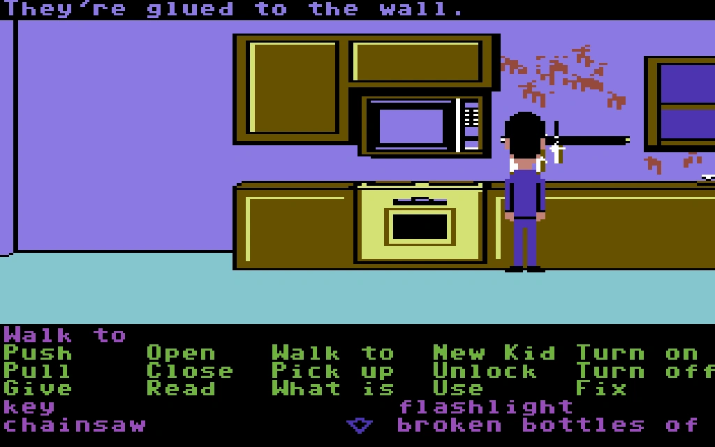 Pod animačním obrázkem je jedna řádka pro konstrukci příkazové věty. I to je jeden z „vynálezů“ programátorů Lucasfilmu. Zatímco u podobných interaktivních her musíte celou větu vypsat na klávesnici (např. u her Sierra On-Line), u Maniac Mansion stačí, když si vyberete jedno z patnácti sloves pod řádkou (najedete na něj kurzorem a stisknete levé tlačítko na myši) a přidáte k němu příslušné podstatné jméno. To si vypůjčíte bud ze seznamu předmětů, které již máte u sebe (ukážete kurzorem na název předmětu), nebo si vyhledáte v animačním rámečku (pak stačí je ukázat kurzorem na žádaný předmět). U některých sloves musíte použit dvě podstatná jména (např. USE KEY IN DOOR – POUŽIJ KLÍČ DO DVEŘÍ). Ve hře je přes 400 předmětů, se kterými můžete manipulovat. Spolu s patnácti slovesy tvoří dost velké množství kombinací, abyste hru dohráli asi tak po týdnu bezesných nocí.