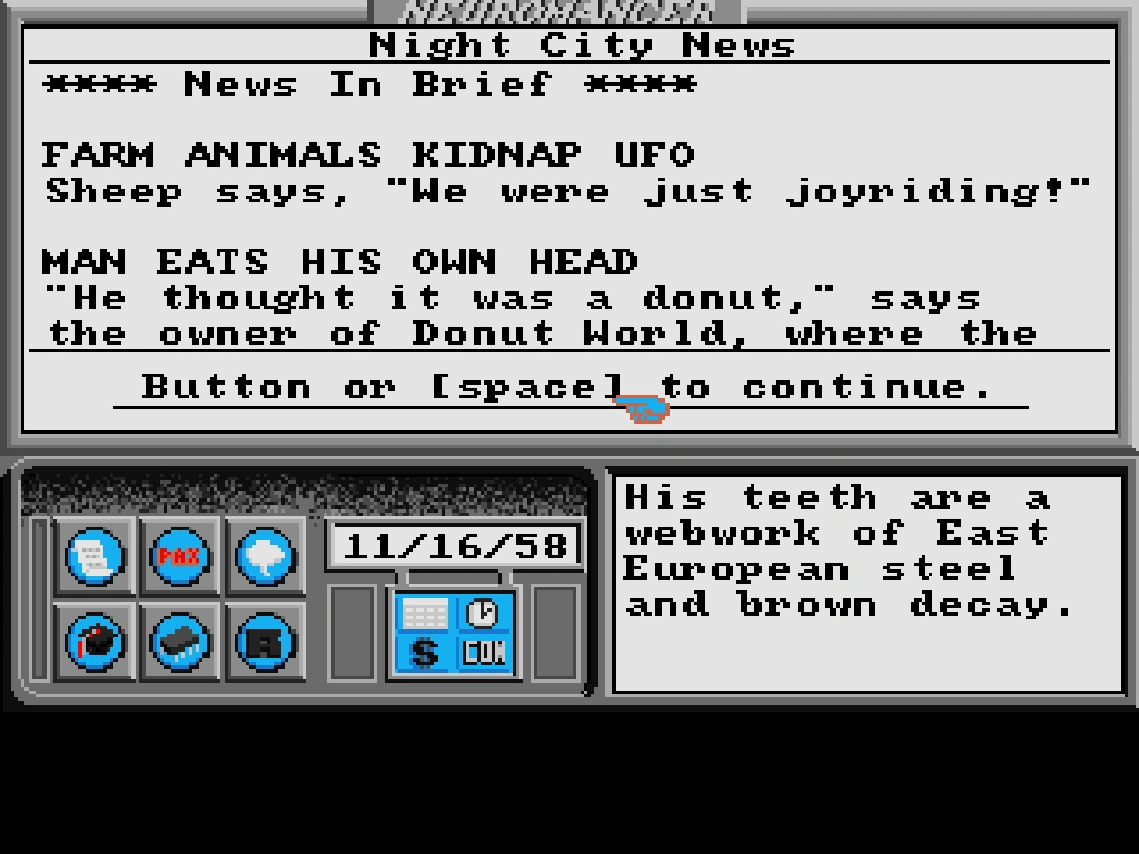 Společnost pomalu upadá do hlubokého morálního kómatu, život ztrácí smysl, vše je kontrolováno obrovskými koncerny a jedinou možností, jak uniknout z této nudy, je proniknutí do kybernetického prostoru (cyberspace), což je vlastně obrovská síť databází celého světa. Zde probíhají boje posledních novodobých romantiků, tzv. “cyberspace cowboys“ s databázemi (tzv. ICE) a tvory s umělou inteligencí (artificial intelligence, zkratka Al). K průniku do cyberspace je třeba počítač (deck), ve kterém je software různého druhu. Ne všechny decky mají možnost vstupu do cyberspace, nejhorší deck na trhu je Blue Light Special, nejlepší Cyberspace VIl. Software lze rozdělit na komunikační programy pro styk s běžnými databázemi i s cyberspacem, dále tzv. “ICE breakery“ pro boje s databázemi, viry, informační programy a řadu dalších. Existuje legální síť databází, která je přístupná každému, kdo zná její linkový kód (link code) a heslo (password). Každá databáze má obvykle několik úrovní (levels), jejich počet lze zjistit programem Scout. Některé databáze jsou chráněny tím, že nemají password, to ale lze obejít pomocí programu zvaného Seguencer, který password vygeneruje sám. Základním komunikačním programem pro styk s databázemi je Comlink (1.0 – 6.0), pomocí verze 6.0 se dá vstoupit do cyberspace, což je možné také později pomocí programu Cyberspace 1.0. Za pobyt v databázi se platí, ale existuje zvláštní bezplatný veřejný systém zvaný PAX, jehož součástí je banka, veřejný informační servis a elektronická pošta. Ve městě si můžete pořídit mimo jiné ještě čipy (skill chips), které je třeba si ihned po koupi implantovat. Některé slouží pro speciální účely (např. Bargaining, Coptalk), jiné pro boj s AI (např. Logic, Sophistry). Každý čip má určitou úroveň (level), kterou je možné zvýšit (tzv. upgrade).
