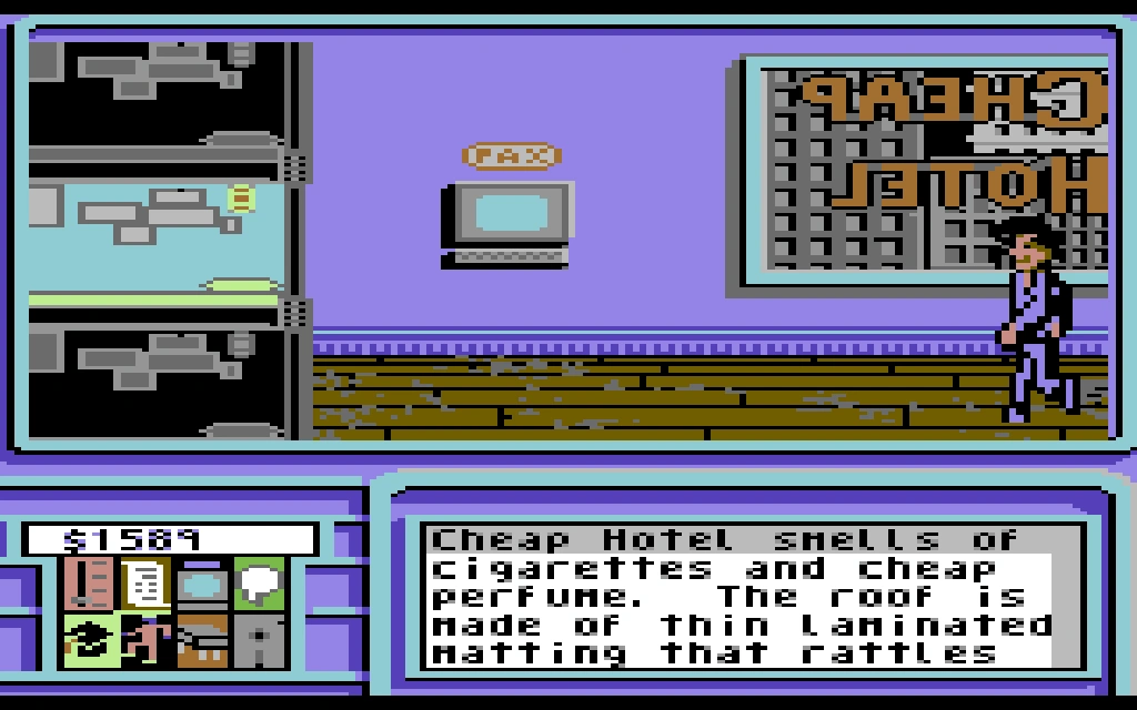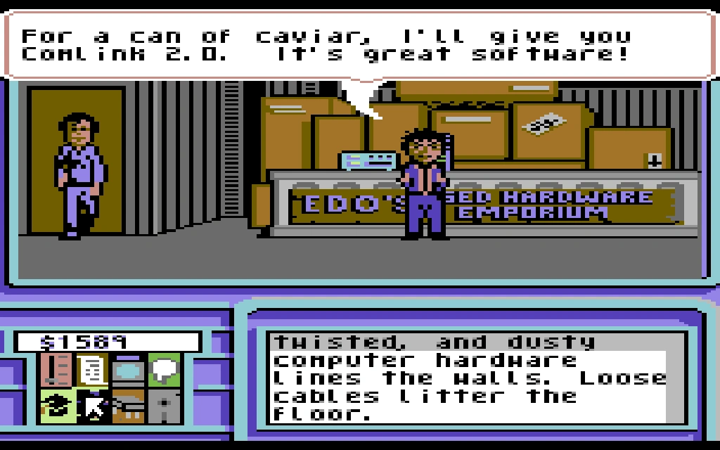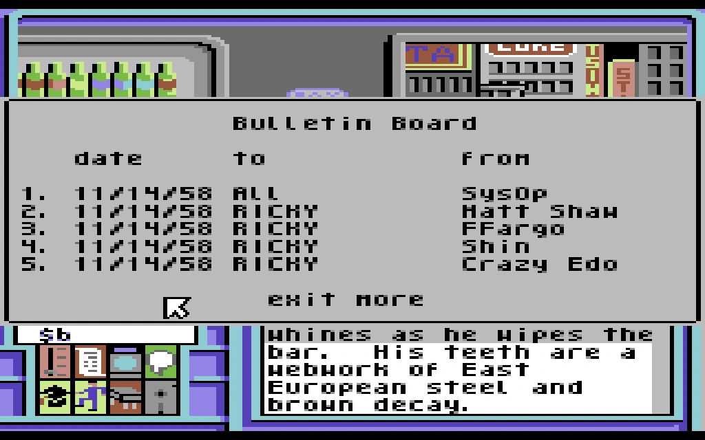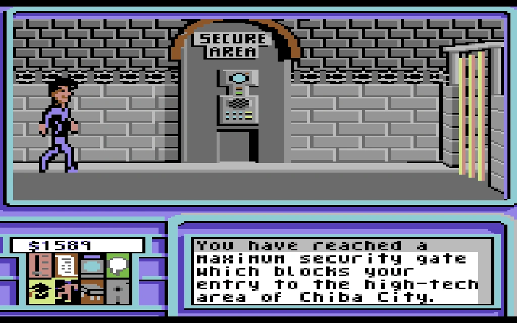 Jste téměř bez peněz a proto si z PAXu vyzvedněte $200. Poté pošlete pánovi jménem ARMITAGE následující hlášení: *“NEED JOB. jméno 056306118″, kde “jméno“ je pochopitelně vaše jméno ve hře. Armitage vám okamžitě pošle na konto $10000. Nyní zaplaťte barmanovi $46. Vyjděte ven na ulici. Všimněte si, že kromě peněz máte ještě lístek ze zastavárny (SHIN S PAWN SHOP), která je poblíž masážního salónu. Vejděte a vyzvedněte si svůj počítač UXB, kde je nahrán komunikační program Comlink 1.0. Nyní jděte do GENTLEMAN LOSER. Zde sedí dívka jménem Shiva, které se zeptejte na CRYPTOLOGY. Cryptology je jeden z čipů, které se vyskytují ve hře a po jeho obdržení si ho okamžitě implantujte. Nyní pomocí Comlinku zavolejte do hotelu (CHEAP HOTEL), kupte si kaviár a zaplaťte účet. Nyní jděte přímo do hotelu a kaviár si vyzvedněte. Dále navštivte obchod s použitými počítači (CRAZY EDO S) a zde za kaviár dostanete Comlink 2.0., Comlink 1.0 můžete pochopitelně smazat. Jděte do dalšího obchodu METRO HOLOGRAPHIX a kupte si od Finna joystick. Jděte do HOUSE OF PONG, dejte mnichovi joystick a dostanete čipy ZEN a SOPHISTRY. Jděte do hotelu a zavolejte PANTHER MODERNS, kde je Comlink 3.0, dále SEA – Comlink 4.0 a Seguencer 1.0, ESFA – Comlink 5.0, TOZOKU – Comlink 6.0, Biowtorch 1.0 a Decoder 1.0, REG. FELLOWS – Battlechess 2.0. Zavolejte na WORLDCHESS, zaplatte členský poplatek a zahrajte si hru. Nyní proveďte několik bankovních operací – zavolejte BANK OF ZURICH (použijte Seguencer na password), otevřete si konto, zavolejte BANK GEMEINSCHAFT a z konta č. 646328356481 vyberte všechny peníze, které zpětně uložte na č. 712345450134 do BANK OF ZURICH (link code je BOZOBANK). V Curyšské bance vám přibyde $30000. Nyní si u Asana kupte nejlepší počítač CYBERSPACE VIll. Je výhodné před Asanem pomlouvat Crazy Eda, ceny počítačů potom budou mnohem nižší. Jděte do G. LOSER a vezměte si od Shivy HARDWARE REPAIRaGUEST PASS (budete ho potřebovat při vstupu do MATRIX RESTAURANT). U Larryho (LARRY S) si kupte COPTALK. U Deana si kupte GAS MASK (ptejte se na EXOTIC HARDWARE) a čipy BARGAINING, PSYCHOANALYSIS, PHENOMENOLOGY a PHILOSOPHY. Ještě proveďte upgrade čipu CRYPTOLOGY. U Finna si kupte ICEBREAKING a DEBUG, v restauraci MATRIX si kupte LOGIC, SOFTWARE ANALYSIS a MUSICIANSHIP a ještě proveďte upgrade některých dalších čipů. Nyní zavolejte na policii a vydejte zatykač na Larryho Moea, tj. zadejte EDIT WARRANTS a kohokoli přepište na jméno LARRY MOE, ID#062788138. Nyní jděte přímo k Larrymu do obchodu a zjistíte, že tam není! Projděte zadními dveřmi a ocitnete se v tajné místnosti, kde už čeká Lupus Yonderboy. Kupte si od něj SECURITY PASS a čip EVASION (upgrade v restauraci Matrix). Zavolejte do Hosaky a přepište jakéhokoli zaměstnance na sebe (jméno a ID). Tak se stanete zaměstnancem této společnosti a znamená to, že budete mít přístup prakticky do všech mistností v Hi-Tech Zone. V Sense/Net použijte Security Pass a vezměte si ROM Construct. Existují dva použitelné typy ROM, buď ROMBO (5521426) nebo výkonnější TOSHIRO (6905984). Ještě si u Finna kupte Drill 1.0, v databázi G. LOSER si pořiďte Hammer 1.0 a máte základní vybavení potřebné pro proniknutí do cyberspace.